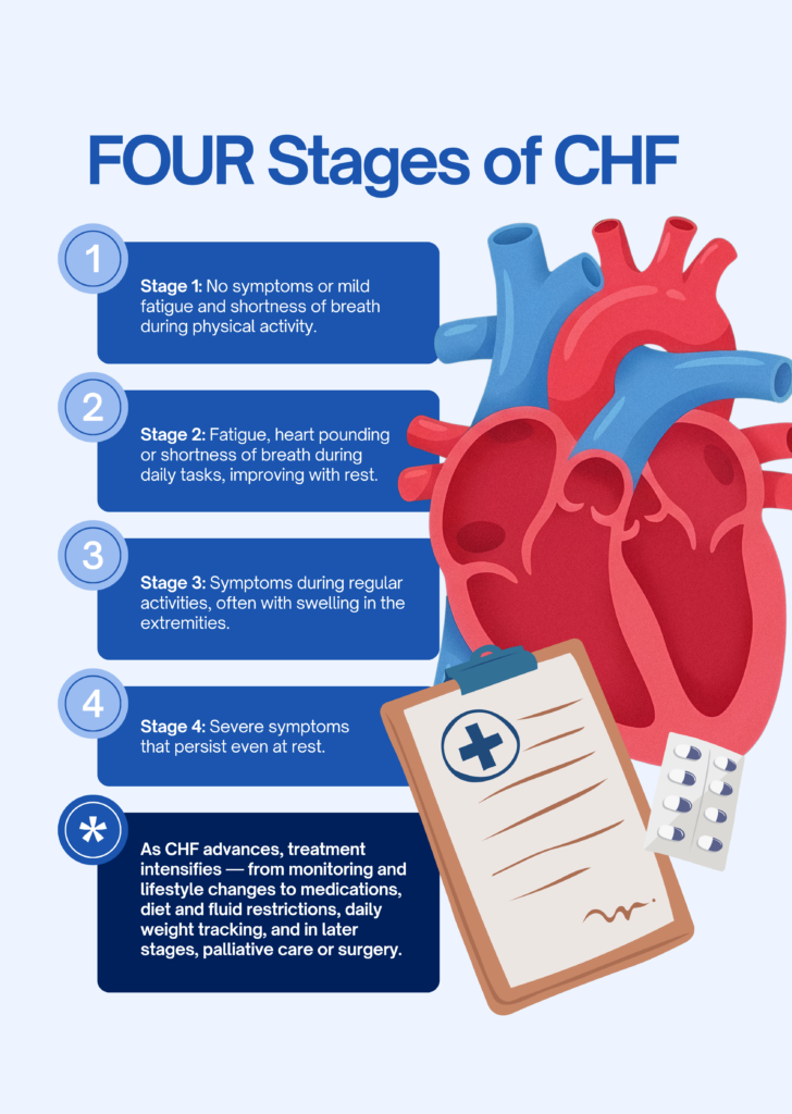To make it easier to visualize, we’ve created a simple infographic that breaks down the four stages of CHF and what to expect at each phase.